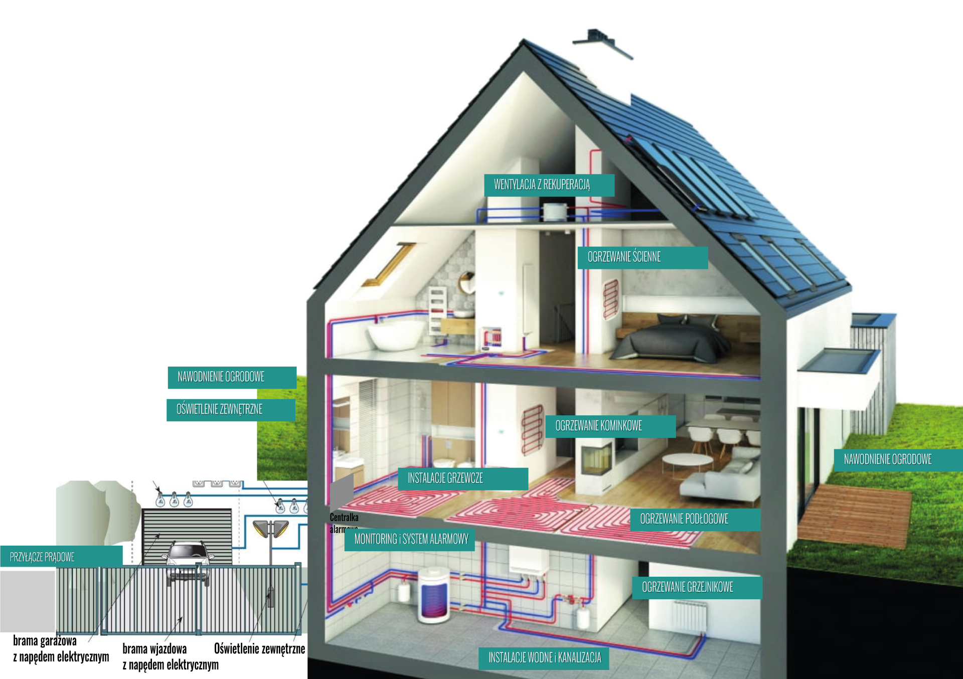 Połączenie systemów monitoringu, alarmu, ogrzewania, klimatyzacji, fotowoltaiki, audio-video, sterowania bramami, roletami, nawodnieniem i oświetleniem daje wiele oszczędności i możliwości, a sterowanie za pomocą wygodnej aplikacji zwiększa komfort, efektywność i funkcjonalność.